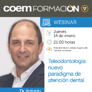 Teleodontología: nuevo paradigma de atención dental. Ponente: Dr. Antonio Expósito. Jueves 14 de enero a las 21:00 horas. Tras la emisión, estará disponible hasta el domingo. Se accede a través de la plataforma de COEM Formación. Solo para colegiados y amigos COEM.